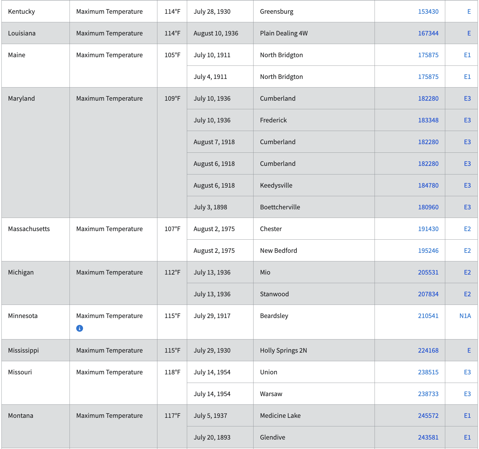 Here are the historical maximum max temperatures for every state in the US, from the NOAA State Climate Extremes database. There are double entries when the max temp is a tie in different years, so there are actually 57 record-breaking-or-equalling years. This chart is up to date as of November 2025. Note the years (red column):